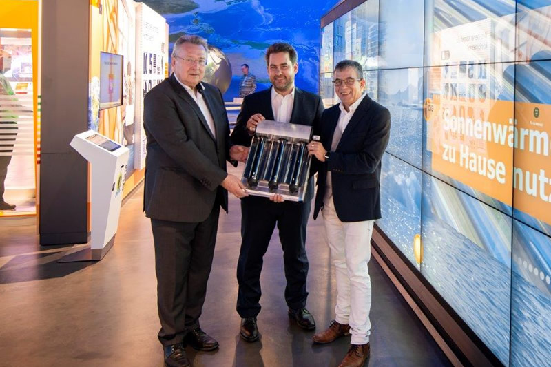 Bei der offiziellen Übergabe des innovativen Solarthermie-Systems hatten Geschäftsführer Moritz Ritter und AVR-Geschäftsführer Peter Mülbaier noch eine besondere Überraschung im Gepäck: Die Firma Ritter sponsert das komplette Kollektorenfeld! Sehr zur Freude des Vorstandsvorsitzenden der Klimastiftung für Bürger Alfred Ehrhard, versteht sich. „Wir leisten damit gerne einen Beitrag zum Erfolg der Klima Arena und hoffen, dass sich möglichst viele Besucher für diese nachhaltige Technik interessieren“, erläutert Moritz Ritter die großzügige Unterstützung. Für AVR-Geschäftsführer Peter Mülbaier ist das Projekt Klima Arena ein erneuter Beleg für die erfolgreiche Kooperation von AVR Energie GmbH und der Ritter Energie- und Umwelttechnik GmbH & Co. KG. „Die Ritter Energie- und Umwelttechnik GmbH & Co. KG liefert die Anlagen und das technische Know-how, die AVR Energie GmbH fungiert als Ansprechpartner und Schnittstelle für sämtliche Vorplanungen, Kostenermittlungen und letztendlich für die finale Realisierung. So wie jetzt die Sinsheimer Klima Arena konnten sich mittlerweile zahlreiche Interessenten aus der gesamten Region von unserer gemeinsamen Leistungsfähigkeit überzeugen“, wirbt Mülbaier für das erfolgreiche Kooperationsmodell.